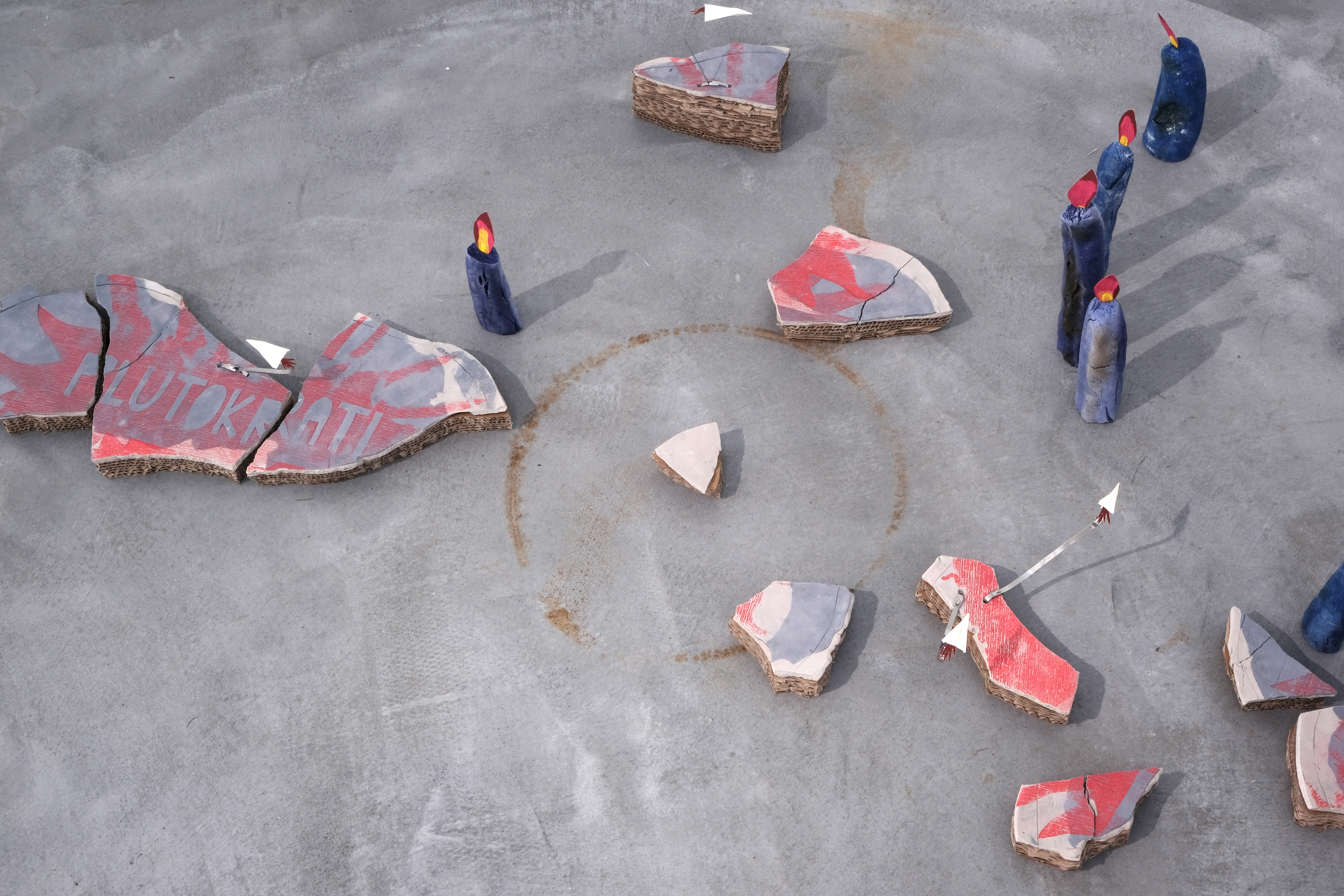 Une prière, CIRCON(ré)VOLUTION : Installation in situ, modelage, dessins et images imprimées, POELP octobre 2024. Une idée simple se présente avec cette installation qui se tient debout comme une scénographie. Une idée simple mais théâtralisée. Elle s’est soulevée d’après la citation de 2017 de l’économiste anarchiste David Graeber : La finance est devenue le plus grand dieu paien omniscient . L’accumulation des richesses de certains est monumentale mais paradoxalement peu visible, difficilement compréhensible et quantifiable. L’installation prend la forme d’un lieu de culte aux inégalités et s’accapare les codes d’une église catholique. En détourne ses codes, et utilise des matériaux peu nobles (tenture en papier bulle injecté de gouache, ex voto en carton, cierge en pâte à pain, etc). Comme une prière profane, Prière articule une collection de formes, écrits et symboles liés aux contestations et aux gestes de la désobéissance à travers l’histoire. L’accumulation des artefacts dessine une cartographie historique, une bibliothèque des résistances et de la mémoire collective.